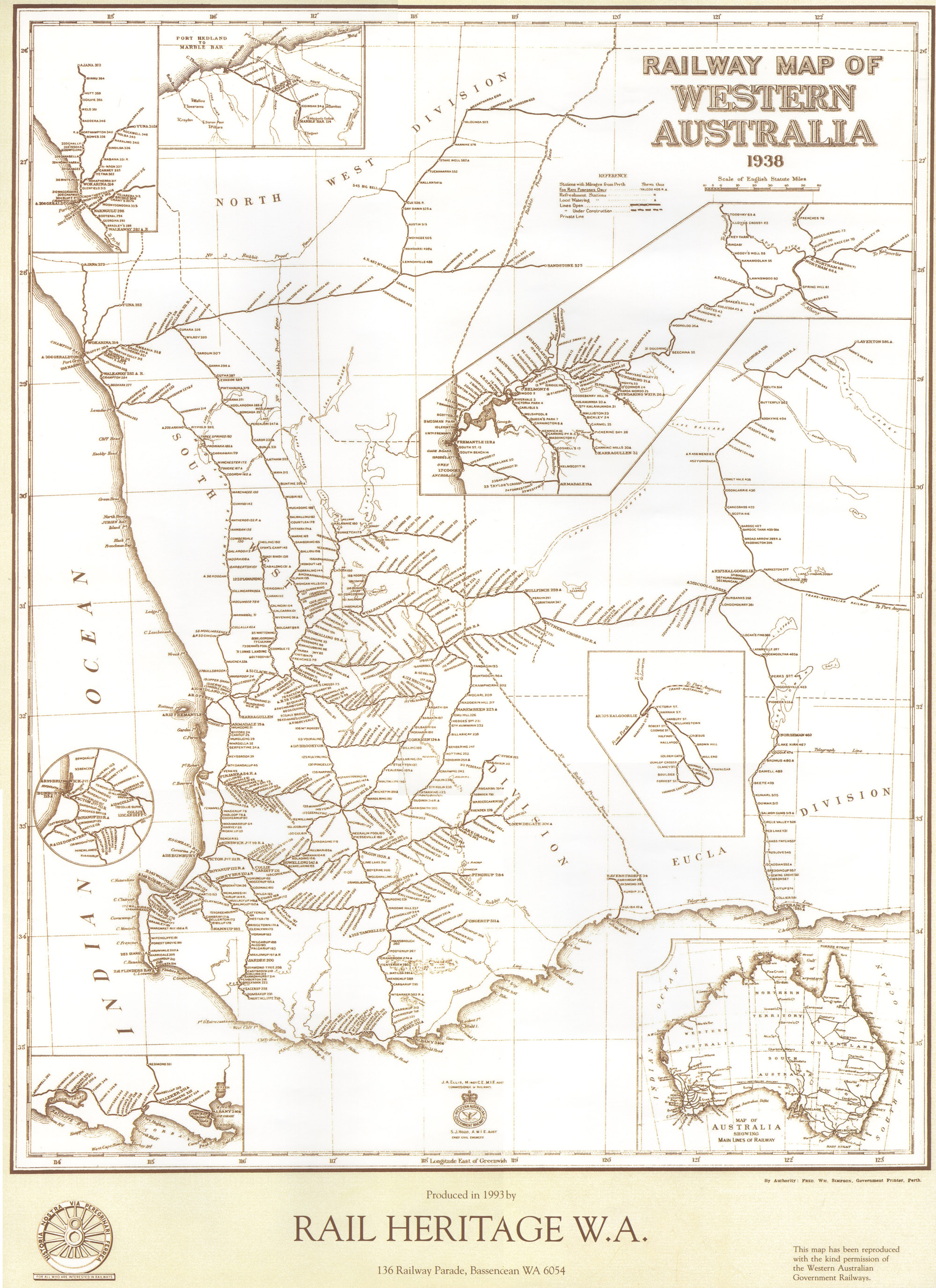 Map of WA railways in 1938 (the maximum extent before motor cars!). This map is also for sale in our shop as a wall poster.How railways have changed through WA's history - a series of annotated maps here.