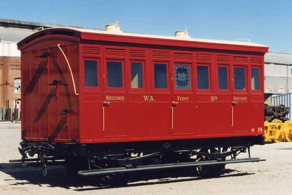 The carriages or "cars" were built by the Metropolitan Railway Carriage and Wagon Company of Birmingham, England. They each had one first class and two second class compartments, seating 22 passengers (six in first class and sixteen in second class). First class had comfortable padded seats. Second class had wooden benches. Lighting was by oil lamps. The coachwork and frame was made of teak and the interior and roof was made of pine. Each coach was 4.9 metres long, 2.3 metres wide, 3.2 metres high and weighed 4.25 tonnes.